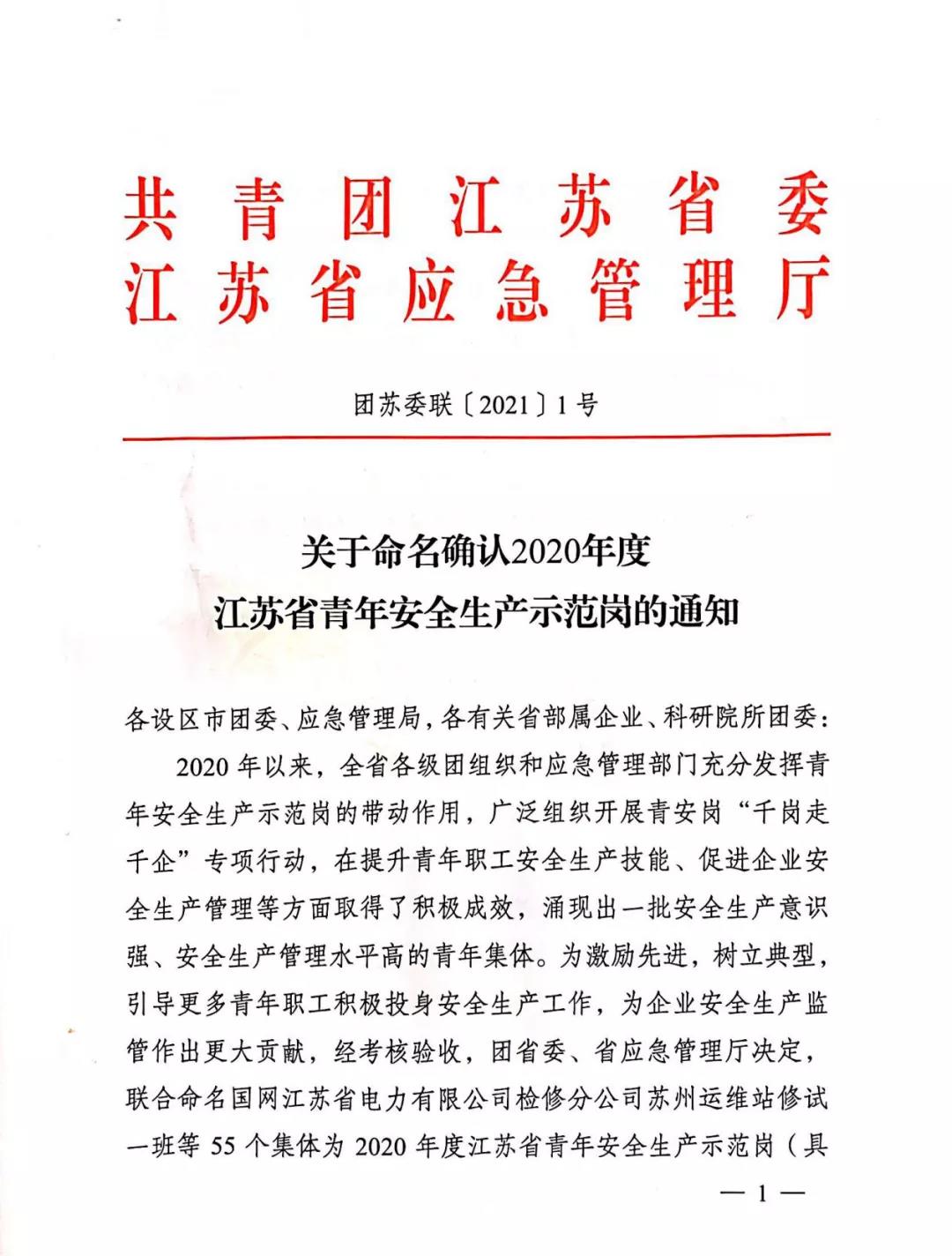 近日,共青团江苏省委、江苏省应急管理厅公布了获得“2020年度江苏省青年安全生产示范岗”荣誉称号的集体名单,玩球通平台_玩球通(中国)一站式服务平台工务事业部动力科获评“2020年度江苏省青年安全生产示范岗”。